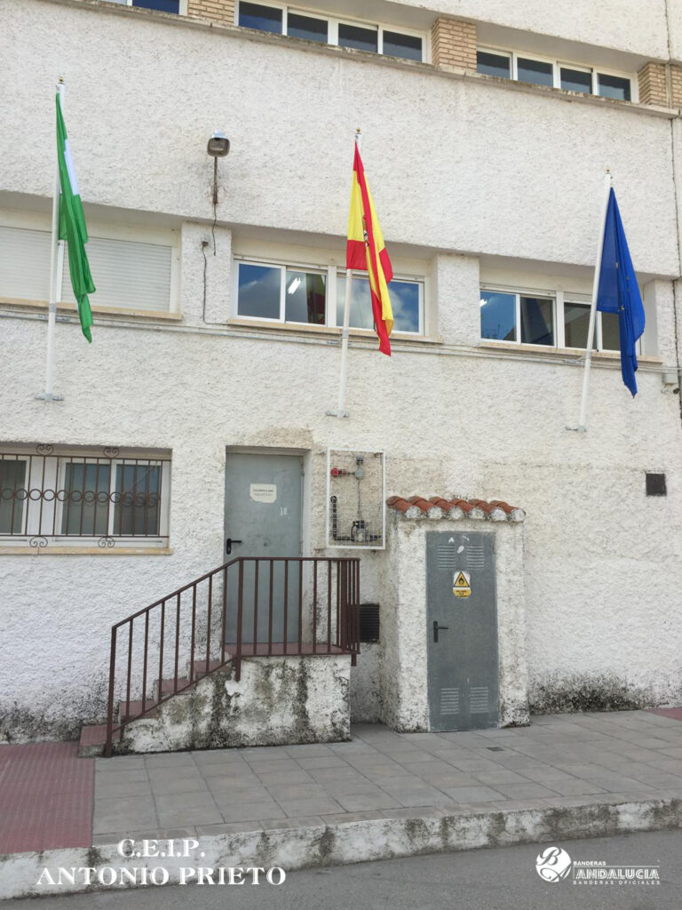 Instalación de tres mástiles y tres banderas: Andalucía, España y Europa en una de las fachadas del centro «CEIP ANTONIO PRIETO» en la localidad de Jaén.
