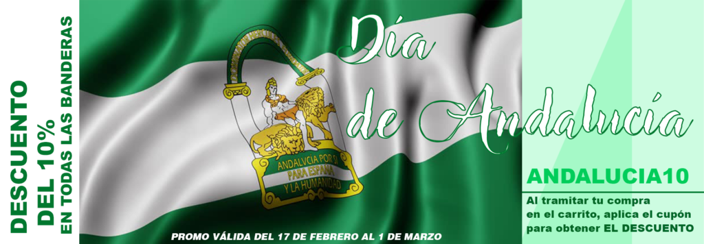 Para celebrar el dia 28 de Febrero por ser el dia de todos los andaluces obsequiamos a todos nuestros clientes un cupon del 10% de descuento en todas las banderas de nuestra web, al finalizar la compra en el carrito solo debes poner ANDALUIA10 y obtendrás el descuento, la promo es valida del 17 de Febrero al 1 de Marzo, ¡NO OS QUEDEIS SIN VUESTRO DESCUENTO!
