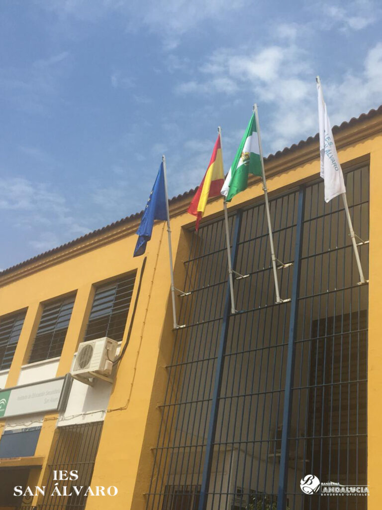 Instalación de cuatro mástiles y cuatro banderas: Europa, España, Andalucía y del centro en la fachada principal del «IES SAN ÁLVARO» en la localidad de Córdoba.